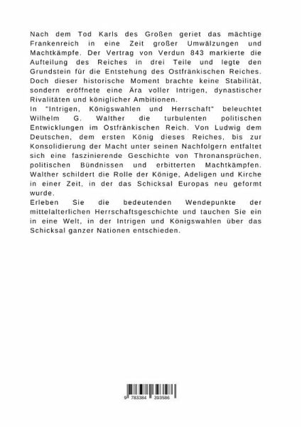 Nach dem Tod Karls des Großen geriet das mächtige Frankenreich in eine Zeit großer Umwälzungen und Machtkämpfe. Der Vertrag von Verdun 843 markierte die Aufteilung des Reiches in drei Teile und legte den Grundstein für die Entstehung des Ostfränkischen Reiches. Doch dieser historische Moment brachte keine Stabilität, sondern eröffnete eine Ära voller Intrigen, dynastischer Rivalitäten und königlicher Ambitionen.In "Intrigen, Königswahlen und Herrschaft" beleuchtet Wilhelm G. Walther die turbulenten politischen Entwicklungen im Ostfränkischen Reich. Von Ludwig dem Deutschen, dem ersten König dieses Reiches, bis zur Konsolidierung der Macht unter seinen Nachfolgern entfaltet sich eine faszinierende Geschichte von Thronansprüchen, politischen Bündnissen und erbitterten Machtkämpfen. Walther schildert die Rolle der Könige, Adeligen und Kirche in einer Zeit, in der das Schicksal Europas neu geformt wurde.Erleben Sie die bedeutenden Wendepunkte der mittelalterlichen Herrschaftsgeschichte und tauchen Sie ein in eine Welt, in der Intrigen und Königswahlen über das Schicksal ganzer Nationen entschieden.
