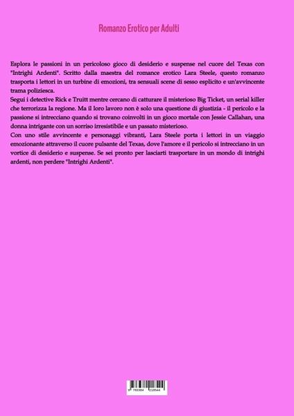 Esplora le passioni in un pericoloso gioco di desiderio e suspense nel cuore del Texas con "Intrighi Ardenti". Scritto dalla maestra del romance erotico Lara Steele, questo romanzo trasporta i lettori in un turbine di emozioni, tra sensuali scene di sesso esplicito e un'avvincente trama poliziesca.Segui i detective Rick e Truitt mentre cercano di catturare il misterioso Big Ticket, un serial killer che terrorizza la regione. Ma il loro lavoro non è solo una questione di giustizia - il pericolo e la passione si intrecciano quando si trovano coinvolti in un gioco mortale con Jessie Callahan, una donna intrigante con un sorriso irresistibile e un passato misterioso.Con uno stile avvincente e personaggi vibranti, Lara Steele porta i lettori in un viaggio emozionante attraverso il cuore pulsante del Texas, dove l'amore e il pericolo si intrecciano in un vortice di desiderio e suspense. Se sei pronto per lasciarti trasportare in un mondo di intrighi ardenti, non perdere "Intrighi Ardenti".