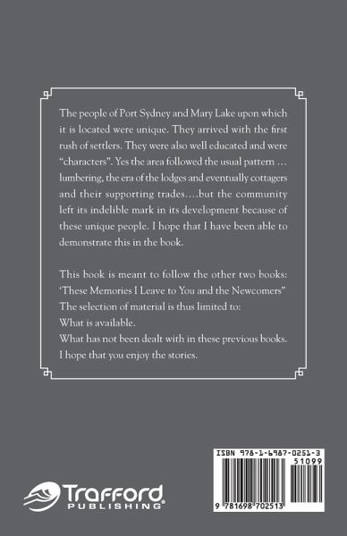 The people of Port Sydney and Mary Lake upon which it is located were unique. They arrived with the first rush of settlers. They were also well educated and were "characters". Yes the area followed the usual pattern ...lumbering, the era of the lodges and eventually cottagers and their supporting trades....but the community left its indelible mark in its development because of these unique people. I hope that I have been able to demonstrate this in the book. This book is meant to follow the other two books: 'These Memories I Leave to You and the Newcomers" The selection of material is thus limited to: What is available. What has not been dealt with in these previous books. I hope that you enjoy the stories.