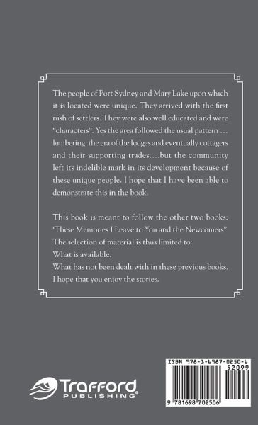 The people of Port Sydney and Mary Lake upon which it is located were unique. They arrived with the first rush of settlers. They were also well educated and were "characters". Yes the area followed the usual pattern ...lumbering, the era of the lodges and eventually cottagers and their supporting trades....but the community left its indelible mark in its development because of these unique people. I hope that I have been able to demonstrate this in the book. This book is meant to follow the other two books: 'These Memories I Leave to You and the Newcomers" The selection of material is thus limited to: What is available. What has not been dealt with in these previous books. I hope that you enjoy the stories.
