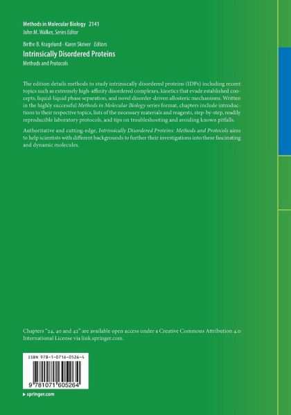Disorder for Dummies: Functional Mutagenesis of Transient Helical Segments in Disordered Proteins.- Computational Prediction of Intrinsic Disorder in Protein Sequences with the disCoP Meta-predictor.- Computational Prediction of Disordered Protein Motifs using SLiMSuite.- How to Annotate and Submit a Short Linear Motif to the Eukaryotic Linear Motif Resource.- Analyzing the Sequences of Intrinsically Disordered Regions with CIDER and localCIDER.- Exploring Protein Intrinsic Disorder with MobiDB.- An Easy Protocol for Evolutionary Analysis of Intrinsically Disordered Proteins.- Expression and Purification of an Intrinsically Disordered Protein.- Production of Intrinsically Disordered Proteins for Biophysical Studies; Tips and Tricks.- Recombinant Production of Monomeric Isotope-Enriched Aggregation-Prone Peptides: Polyglutamine Tracts and Beyond.- Cell-free Protein Synthesis of Small Intrinsically Disordered Proteins for NMR Spectroscopy.- Structural Analyses of Intrinsically Disordered Proteins by Small-Angle X-ray Scattering.- Determining Rg of IDPs from SAXS data.- Obtaining Hydrodynamic Radii of Intrinsically Disordered Protein Ensembles by Pulsed Field Gradient NMR Measurements.- Quantitative Protein Disorder Assessment using NMR Chemical Shifts.- Determination of pKa Values in Intrinsically Disordered Proteins.- Paris-DÉCOR: A Protocol for the Determination of Fast Protein Backbone Amide Hydrogen Exchange Rates.- Predicting Conformational Properties of Intrinsically Disordered Proteins from Sequence.- Enhanced Molecular Dynamics Simulations of Intrinsically Disordered Proteins.- Computational Protocol for Determining Conformational Ensembles of Intrinsically Disordered Proteins.- Computing, Analyzing and Comparing the Radius of Gyration and Hydrodynamic Radius in Conformational Ensembles of Intrinsically Disordered Proteins.- Binding Thermodynamics to Intrinsically Disordered Protein Domains.- Analysis of Multivalent IDP Interactions: Stoichiometry, Affinity, and Local Concentration Effect Measurements.- NMR Lineshape Analysis of Intrinsically Disordered Protein Interactions.- Measuring Effective Concentrations Enforced by Intrinsically Disordered Linkers.- Determining the Protective Activity of IDPs under Partial Dehydration and Freeze-thaw Conditions.- Screening Intrinsically Disordered Regions for Short Linear Binding Motifs.- Probing IDP Interactions with Membranes by Fluorescence Spectroscopy.- Protocol for Investigating the Interactions between Intrinsically Disordered Proteins and Membranes by Neutron Reflectometry.- Interactions of IDPs with Membranes Using Dark State Exchange NMR Spectroscopy.- Determination of Binding Kinetics of Intrinsically Disordered Proteins by Surface Plasmon Resonance.- Measuring and Analysing Binding Kinetics of Coupled Folding and BindingReactions under Pseudo-first Order Conditions.- Understanding Binding Induced Folding by Temperature Jump.- Determining Binding Kinetics of Intrinsically Disordered Proteins by NMR spectroscopy.- Determination of Protein Phase Diagrams by Centrifugation.- In vitro Transition Temperature Measurement of Phase Separating Proteins by Microscopy.- Walking along a Protein Phase Diagram to Determine Coexistence Points by Static Light Scattering.- Expression and Purification of Intrinsically Disordered Abeta Peptide and Setup of Reproducible Aggregation Kinetics Experiment.- Measuring Interactions between Tau and Aggregation Inducers with Single Molecule Förster Resonance Energy Transfer.- Detection of Multisite Phosphorylation of Intrinsically Disordered Proteins using Phos-tag SDS-PAGE.- Multiple Site-specific Phosphorylation of IDPs Monitored by NMR.- Detection of Multisite Phosphorylation of Intrinsically Disordered Proteins usingQuantitative Mass-Spectrometry.- Targeting an Intrinsically Disordered Protein by Covalent Modification.- Recording in-cell NMR-spectra in Living Mammalian Cells.- In-cell NMR of Intrinsically Disordered Proteins in Mammalian Cells.- Analyzing IDPs in Interactomes.