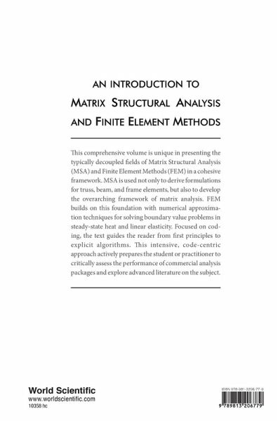 This comprehensive volume is unique in presenting the typically decoupled fields of Matrix Structural Analysis (MSA) and Finite Element Methods (FEM) in a cohesive framework. MSA is used not only to derive formulations for truss, beam, and frame elements, but also to develop the overarching framework of matrix analysis. FEM builds on this foundation with numerical approximation techniques for solving boundary value problems in steady-state heat and linear elasticity. Focused on coding, the text guides the reader from first principles to explicit algorithms. This intensive, code-centric approach actively prepares the student or practitioner to critically assess the performance of commercial analysis packages and explore advanced literature on the subject.