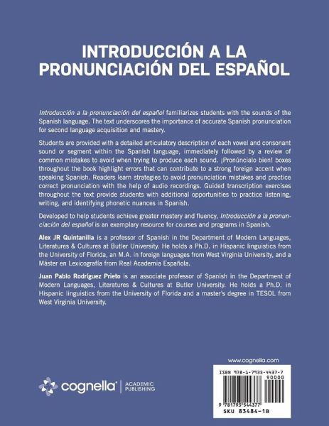 Introducción a la pronunciación del español familiarizes students with the sounds of the Spanish language. The text underscores the importance of accurate Spanish pronunciation for second language acquisition and mastery. Students are provided with a detailed articulatory description of each vowel and consonant sound or segment within the Spanish language, immediately followed by a review of common mistakes to avoid when trying to produce each sound. ¡Pronúncialo bien! boxes throughout the book highlight errors that can contribute to a strong foreign accent when speaking Spanish. Readers learn strategies to avoid pronunciation mistakes and practice correct pronunciation with the help of audio recordings. Guided transcription exercises throughout the text provide students with additional opportunities to practice listening, writing, and identifying phonetic nuances in Spanish. Developed to help students achieve greater mastery and fluency, Introducción a la pronunciación del español is an exemplary resource for courses and programs in Spanish.