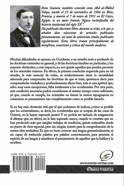Muchas dificultades se oponen, en Occidente, a un estudio serio y profundo de las doctrinas orientales en general, y de las doctrinas hindúes en particular; y los mayores obstáculos, a este respecto, no son quizás aquellos que pueden provenir de los orientales mismos. En efecto, la primera condición requerida para un tal estudio, la más esencial de todas, es evidentemente tener la mentalidad adecuada para comprender las doctrinas de que se trata, queremos decir para comprenderlas verdadera y profundamente; ahora bien, ésta es una aptitud que, salvo muy raras excepciones, falta totalmente a los occidentales. Por otra parte, esta condición necesaria podría considerarse al mismo tiempo como suficiente, ya que, cuando se cumple, los orientales no tienen la menor repugnancia en comunicar su pensamiento tan completamente como es posible hacerlo. Si no hay más obstáculo real que el que acabamos de indicar, ¿cómo es posible que los «orientalistas», es decir, los occidentales que se ocupan de las cosas de Oriente, no le hayan superado jamás? Y no podría ser tachado de exageración el afirmar que, en efecto, no le han superado nunca, cuando se constata que no han producido más que simples trabajos de erudición, quizás estimables desde un punto de vista especial, pero sin ningún interés para la comprehensión de la menor idea verdadera. Es que no basta conocer una lengua gramaticalmente, ni ser capaz de traducirla palabra por palabra correctamente, para penetrar el espíritu de esa lengua y asimilarse el pensamiento de aquellos que la hablan y la escriben.