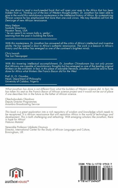 You are about to read a much-needed book that will open your eyes to the Africa that has been hidden from us. Thinking out of the box of Western thought pattern, Dr. Jonathan has been able to give to the world this revolutionary masterpiece in the intellectual history of Africa. By systematizing African science he has emphasized that more than one cock crows. We may therefore call him the Demiurge of new African renaissance. Mary Nelson Sankofa Directions Houston Texas, USA ' Se wo were fi na wosan kofa a, yenkyi.' Learning from the past in building the future ----------------------------------------------------------------- With this masterpiece, Dr. Jonathan has answered all the critics of Africa's intellectual and inventive ability. He has opened a door to Africa's authentic renaissance. The work is a beacon in Africa's history and the author has emerged as one of the continent's brightest minds. Chris Iwarah The Sun Newspaper ---------------------------------------------------------------- With this towering intellectual accomplishment, Dr. Jonathan Chimakonam has not only proven that Africans are capable of revolutionary thoughts but has emerged as one of the leading original thinkers on the continent. In fact, in this piece of adorable literature, Jonathan could be said to have done for Africa what thinkers like Francis Bacon did for the West Prof. G. O. Ozumba Head, Department of Philosophy University of Calabar, Nigeria ----------------------------------------------------------------- What Jonathan has done is not different from what the builders of Western science did. In fact, he has taken his seat as the Francis Bacon of African science project and it would not be out of place if one describes him in the future as the father of African science. Okechukwukelu Okonkwo Deputy Director Programmes Anambra Broadcasting Service ----------------------------------------------------------------- This book is a great exploration into a rich repository of wisdom and knowledge which needs to be recaptured. It is African renaissance that will reposition Africa in the world of technology and development. This is both challenging and refreshing. With emerging scholars like Jonathan, there is hope for Africa! Hakuna Matata! Venerable Professor Udobata Onunwa Director, International Center for the Study of African Languages and Culture, Birmingham, UK