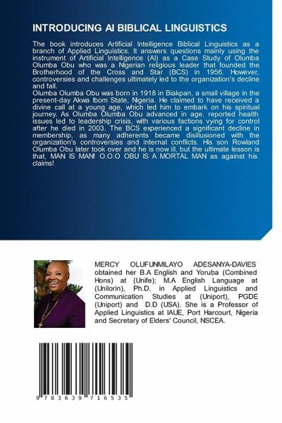 The book introduces Artificial Intelligence Biblical Linguistics as a branch of Applied Linguistics. It answers questions mainly using the instrument of Artificial Intelligence (AI) as a Case Study of Olumba Olumba Obu who was a Nigerian religious leader that founded the Brotherhood of the Cross and Star (BCS) in 1956. However, controversies and challenges ultimately led to the organization's decline and fall.Olumba Olumba Obu was born in 1918 in Biakpan, a small village in the present-day Akwa Ibom State, Nigeria. He claimed to have received a divine call at a young age, which led him to embark on his spiritual journey. As Olumba Olumba Obu advanced in age, reported health issues led to leadership crisis, with various factions vying for control after he died in 2003. The BCS experienced a significant decline in membership, as many adherents became disillusioned with the organization's controversies and internal conflicts. His son Rowland Olumba Obu later took over and he is now ill, but the ultimate lesson is that, MAN IS MAN! O.O.O OBU IS A MORTAL MAN as against his claims!