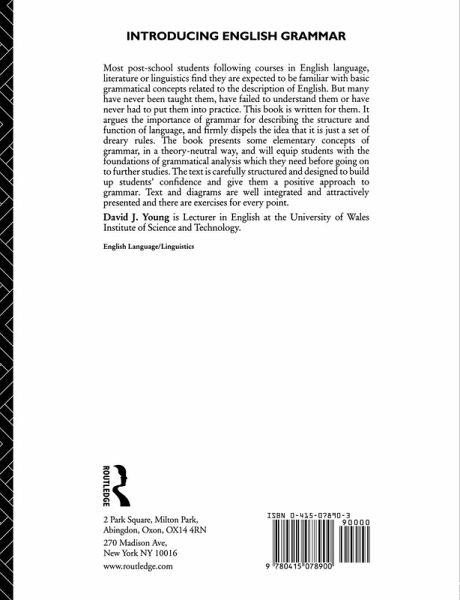 Introducing English Grammar provides a basic grounding in English grammar, without going into too much detail or theory, and will lay the foundation for further grammatical studies. David Young presents English grammar in a coherent and lively way. He dispels the popular notion among students that grammar is simply a set of dreary rules and argues for the importance of grammar in describing the structure and function of language itself. Exercises are provided at the end of each chapter and the book includes integrated diagrams and a glossary of technical terms at the back of the book.