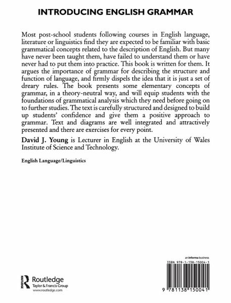 Introducing English Grammar provides a basic grounding in English grammar, without going into too much detail or theory, and will lay the foundation for further grammatical studies. David Young presents English grammar in a coherent and lively way. He dispels the popular notion among students that grammar is simply a set of dreary rules and argues for the importance of grammar in describing the structure and function of language itself. Exercises are provided at the end of each chapter and the book includes integrated diagrams and a glossary of technical terms at the back of the book.