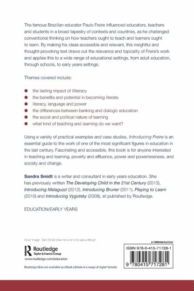 The famous Brazilian educator Paulo Freire has influenced educators, teachers and students in a broad tapestry of contexts and countries, as he challenged conventional thinking on how teachers ought to teach and learners ought to learn. By making his ideas accessible and relevant, this insightful and thought-provoking text draws out the relevance and topicality of Freire's work and applies this to a wide range of educational settings, from adult education, through schools, to early years settings. Themes covered include: the lasting impact of illiteracy; the benefits and potential in becoming literate; literacy, language and power; the differences between banking and dialogic education; the social and political nature of learning. what kind of teaching and learning do we want? Using a variety of practical examples and case studies, Introducing Freire is an essential guide to the work of one of the most significant figures in education in the last century. Fascinating and accessible, this book is for anyone interested in teaching and learning, poverty and affluence, power and powerlessness, and society and change.