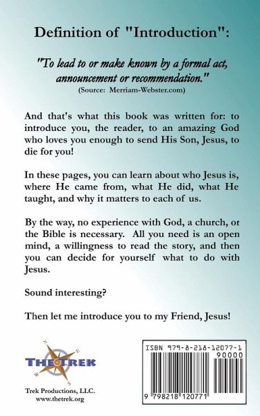 This book was written to introduce you, the reader, to an amazing God who loves you enough to send His Son, Jesus, to die for you! In these pages, you can learn about who Jesus is, where He came from, what He did, what He taught, and why it matters to each of us. By the way, no experience with God, a church, or the Bible is necessary. All you need is an open mind, a willingness to read the story, and then you can decide for yourself what to do with Jesus. Sound interesting? Then let me introduce you to my Friend, Jesus!