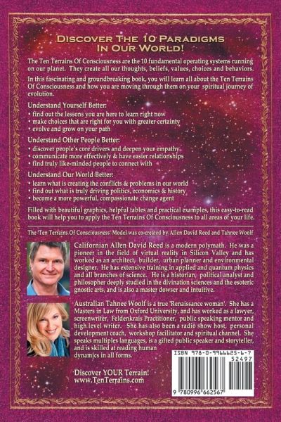 Discover The 10 Paradigms In Our World! The Ten Terrains Of Consciousness are the 10 fundamental operating systems running on our planet. They create all our thoughts, beliefs, values, actions, choices and behaviors. In this fascinating and groundbreaking book, you will learn all about the Ten Terrains Of Consciousness and how you are moving through them on your spiritual journey of evolution. Understand yourself better: find out the lessons you are here to learn right now make choices that are right for you with greater certainty evolve and grow on your path Understand other people better: discover peoples core drivers and deepen your empathy communicate more effectively & have easier relationships find truly like-minded people to connect with Understand our world better: learn what is creating the conflicts & problems in our world find out what is truly driving politics, economics & history become a more powerful, compassionate change agent Filled with beautiful graphics, helpful tables and practical examples, this easy-to-read book will help you to apply the Ten Terrains Of Consciousness to all areas of your life.