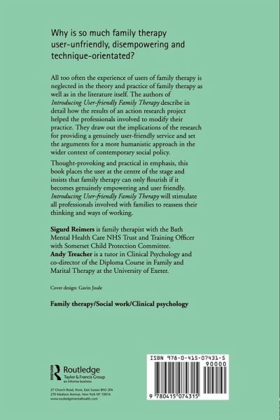 All too often the experience of users of family therapy is neglected in the theory and practice of family therapy as well as in the literature itself. In Introducing User-Friendly Family Therapy the authors describe in detail how the results of an action research project helped the professionals involved to modify their practice. They draw out the implications of the research for providing a genuinely user-friendly service and set the arguments for a more humanistic approach in the wider context of contemporary social policy. Thought-provoking and practical in emphasis, this book places the user at the centre of the stage and insists that family therapy can only flourish if it becomes genuinely empowering and user-friendly.