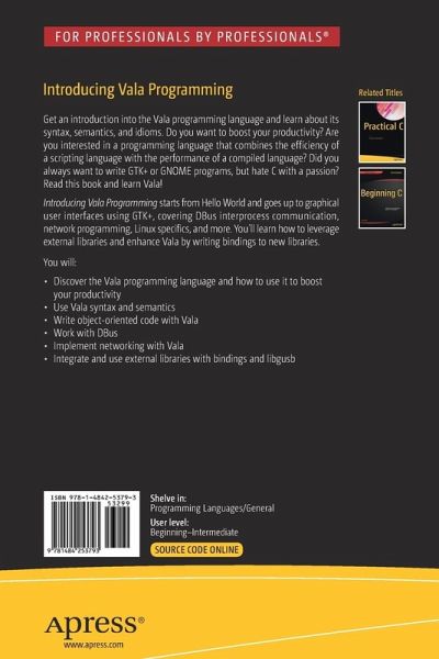 What You Will LearnDiscover the Vala programming language and how to use it to boost your productivityUse Vala syntax and semanticsWrite object-oriented code with ValaWork with DBusImplement networking with ValaIntegrate and use external libraries with bindings and libgusb
