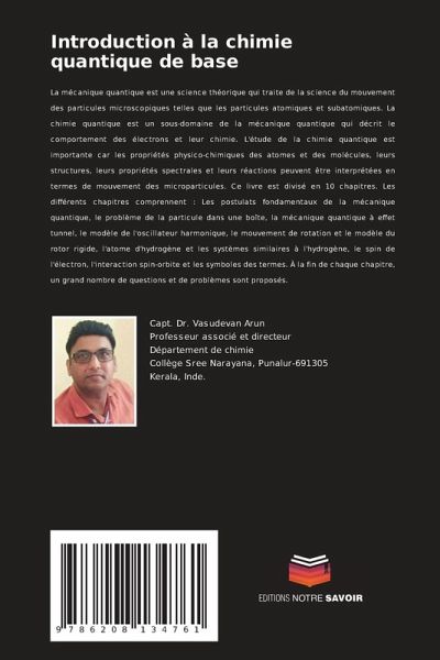 La mécanique quantique est une science théorique qui traite de la science du mouvement des particules microscopiques telles que les particules atomiques et subatomiques. La chimie quantique est un sous-domaine de la mécanique quantique qui décrit le comportement des électrons et leur chimie. L'étude de la chimie quantique est importante car les propriétés physico-chimiques des atomes et des molécules, leurs structures, leurs propriétés spectrales et leurs réactions peuvent être interprétées en termes de mouvement des microparticules. Ce livre est divisé en 10 chapitres. Les différents chapitres comprennent : Les postulats fondamentaux de la mécanique quantique, le problème de la particule dans une boîte, la mécanique quantique à effet tunnel, le modèle de l'oscillateur harmonique, le mouvement de rotation et le modèle du rotor rigide, l'atome d'hydrogène et les systèmes similaires à l'hydrogène, le spin de l'électron, l'interaction spin-orbite et les symboles des termes. À la fin de chaque chapitre, un grand nombre de questions et de problèmes sont proposés.