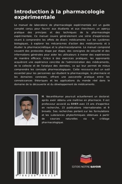 Le manuel de laboratoire de pharmacologie expérimentale est un guide complet conçu pour fournir aux étudiants et aux chercheurs un aperçu pratique des principes et des techniques de la pharmacologie expérimentale. Ce manuel couvre généralement une série d'expériences visant à comprendre les effets de divers médicaments sur les systèmes biologiques, à explorer les mécanismes d'action des médicaments et à étudier la pharmacocinétique et la pharmacodynamie. Le manuel comprend souvent des protocoles étape par étape, des consignes de sécurité et des informations générales pour aider les utilisateurs à mener des expériences de manière efficace. Grâce à des exercices pratiques, les apprenants acquièrent une expérience concrète de l'administration des médicaments, de la collecte et de l'analyse des données, ce qui leur permet de mieux comprendre les concepts pharmacologiques. Cette ressource est un outil essentiel pour les personnes qui étudient la pharmacologie, la pharmacie et les domaines connexes, offrant une passerelle pratique entre les connaissances théoriques et les applications du monde réel dans le domaine de la découverte et du développement de médicaments.