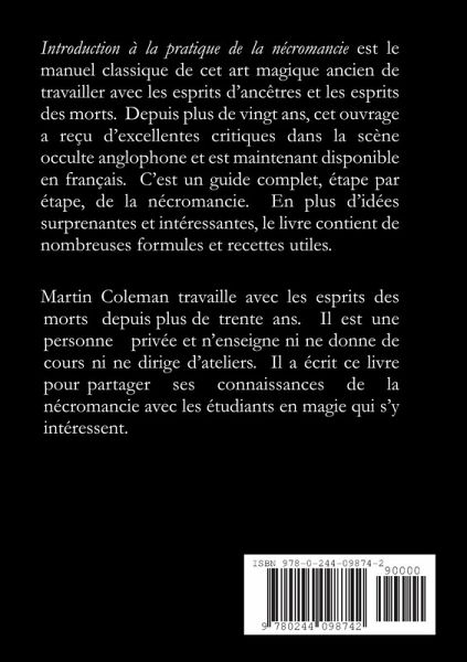 Introduction à la pratique de la nécromancie est le manuel classique de cet art magique ancien de travailler avec les esprits d'ancêtres et les esprits des morts. Depuis plus de vingt ans, cet ouvrage a reçu d'excellentes critiques dans la scène occulte anglophone et est maintenant disponible en français. C'est un guide complet, étape par étape, de la nécromancie. En plus d'idées surprenantes et intéressantes, le livre contient de nombreuses formules et recettes utiles.