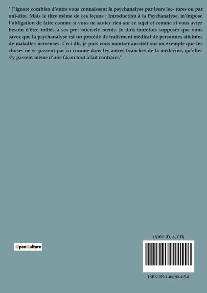 " J¿ignore combien d¿entre vous connaissent la psychanalyse par leurs lec- tures ou par ouï-dire. Mais le titre même de ces leçons : Introduction à la Psychanalyse, m¿impose l¿obligation de faire comme si vous ne saviez rien sur ce sujet et comme si vous aviez besoin d¿être initiés à ses pre- miersélé ments. Je dois toutefois supposer que vous savez que la psychanalyse est un procédé de traitement médical de personnes atteintes de maladies nerveuses. Ceci dit, je puis vous montrer aussitôt sur un exemple que les choses ne se passent pas ici comme dans les autres branches de la médecine, qüelles s¿y passent même d¿une façon tout à fait contraire."