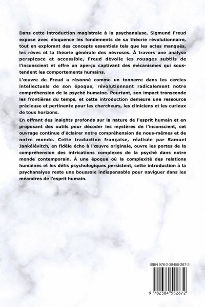 Dans cette introduction magistrale à la psychanalyse, Sigmund Freud expose avec éloquence les fondements de sa théorie révolutionnaire, tout en explorant des concepts essentiels tels que les actes manqués, les rêves et la théorie générale des névroses. À travers une analyse perspicace et accessible, Freud dévoile les rouages subtils de l'inconscient et offre un aperçu captivant des mécanismes qui sous-tendent les comportements humains.L'¿uvre de Freud a résonné comme un tonnerre dans les cercles intellectuels de son époque, révolutionnant radicalement notre compréhension de la psyché humaine. Pourtant, son impact transcende les frontières du temps, et cette introduction demeure une ressource précieuse et pertinente pour les chercheurs, les cliniciens et les curieux de tous horizons.En offrant des insights profonds sur la nature de l'esprit humain et en proposant des outils pour décoder les mystères de l'inconscient, cet ouvrage continue d'éclairer notre compréhension de nous-mêmes et de notre monde. Cette traduction française, réalisée par Samuel Jankélévitch, en fidèle écho à l'¿uvre originale, ouvre les portes de la compréhension des intrications complexes de la psyché dans notre monde contemporain. À une époque où la complexité des relations humaines et les défis psychologiques persistent, cette introduction à la psychanalyse reste une boussole indispensable pour naviguer dans les méandres de l'esprit humain.