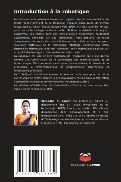 Le domaine de la robotique trouve ses origines dans la science-fiction. Le terme "robot" provient de la traduction anglaise d'une pièce de théâtre fantastique écrite en Tchécoslovaquie vers 1920. Il a fallu attendre 40 ans pour que la technologie moderne de la robotique industrielle voie le jour. Aujourd'hui, les robots sont des manipulateurs mécaniques hautement automatisés, contrôlés par des ordinateurs. Nous passons en revue quelques-uns des récits de science-fiction sur les robots et nous retraçons l'évolution historique de la technologie robotique. Commençons notre chapitre en définissant le terme "robotique" et en établissant sa place par rapport à d'autres types d'automatisation industrielle.La robotique est une science appliquée de l'ingénierie qui a été décrite comme une combinaison de la technologie des machines-outils et de l'informatique. Elle comprend la conception des machines, la théorie de la production, la microélectronique, la programmation informatique et l'intelligence artificielle.La "robotique" est définie comme la science de la conception et de la construction de robots adaptés à des applications réelles dans la fabrication automatisée et d'autres environnements non manufacturiers.La définition officielle d'un robot industriel est fournie par l'association des industries de la robotique (RIA).