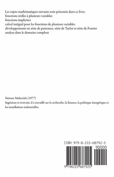 Les sujets mathématiques suivants sont présentés dans ce livre: fonctions réelles à plusieurs variables fonctions implicites calcul intégral pour les fonctions de plusieurs variables développements en série de puissance, série de Taylor et série de Fourier analyse dans le domaine complexe