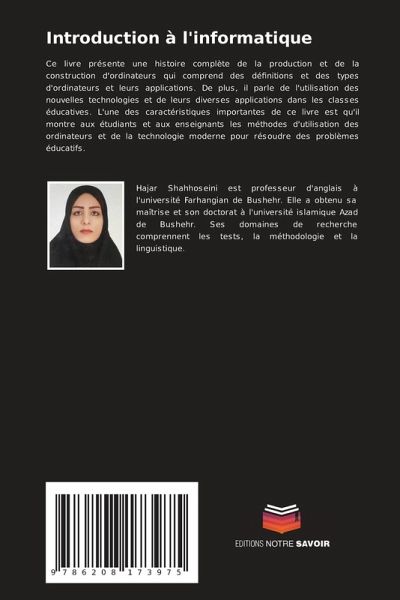 Ce livre présente une histoire complète de la production et de la construction d'ordinateurs qui comprend des définitions et des types d'ordinateurs et leurs applications. De plus, il parle de l'utilisation des nouvelles technologies et de leurs diverses applications dans les classes éducatives. L'une des caractéristiques importantes de ce livre est qu'il montre aux étudiants et aux enseignants les méthodes d'utilisation des ordinateurs et de la technologie moderne pour résoudre des problèmes éducatifs.