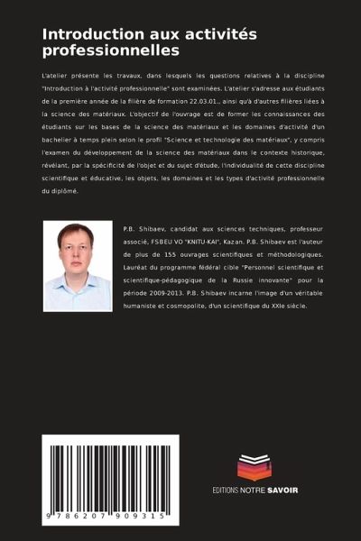 L'atelier présente les travaux, dans lesquels les questions relatives à la discipline "Introduction à l'activité professionnelle" sont examinées. L'atelier s'adresse aux étudiants de la première année de la filière de formation 22.03.01., ainsi qu'à d'autres filières liées à la science des matériaux. L'objectif de l'ouvrage est de former les connaissances des étudiants sur les bases de la science des matériaux et les domaines d'activité d'un bachelier à temps plein selon le profil "Science et technologie des matériaux", y compris l'examen du développement de la science des matériaux dans le contexte historique, révélant, par la spécificité de l'objet et du sujet d'étude, l'individualité de cette discipline scientifique et éducative, les objets, les domaines et les types d'activité professionnelle du diplômé.
