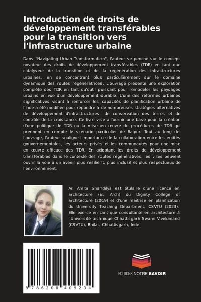 Dans "Navigating Urban Transformation", l'auteur se penche sur le concept novateur des droits de développement transférables (TDR) en tant que catalyseur de la transition et de la régénération des infrastructures urbaines, en se concentrant plus particulièrement sur le domaine dynamique des routes régénératrices. L'ouvrage présente une exploration complète des TDR en tant qu'outil puissant pour remodeler les paysages urbains en vue d'un développement durable. L'une des réformes urbaines significatives visant à renforcer les capacités de planification urbaine de l'Inde a été modifiée pour répondre à de nombreuses stratégies alternatives de développement d'infrastructures, de conservation des terres et de contrôle de la croissance. Ce livre vise à fournir une base pour la création d'une politique de TDR ou la mise en oeuvre de procédures de TDR qui prennent en compte le scénario particulier de Raipur. Tout au long de l'ouvrage, l'auteur souligne l'importance de la collaboration entre les entités gouvernementales, les acteurs privés et les communautés pour une mise en oeuvre efficace des TDR. En adoptant les droits de développement transférables dans le contexte des routes régénératives, les villes peuvent ouvrir la voie à un avenir plus résilient, plus inclusif et plus respectueux de l'environnement.