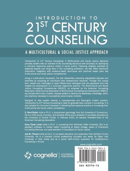 Introduction to 21st Century Counseling: A Multicultural and Social Justice Approach provides readers with an overview of the counseling discipline with emphasis on developing a culturally responsive practice rooted in social justice. Featuring chapters authored by seasoned experts and rising stars in the counseling profession, the text offers traditional information integrated with evidence-based techniques and practices based upon key multicultural and social justice competencies. Using a multicultural framework, the text dismantles commonly stigmatized statuses and identities by proposing that all individuals have intersectional identities. Through this unique lens, readers are prompted to intentionally challenge Westernized ideologies that are oppressive and may impede the development of a culturally responsive practice. The Multicultural and Social Justice Counseling Competencies (MSJCC), as endorsed by the American Counseling Association (ACA) and the Association of Multicultural Counseling and Development (AMCD), are infused within each chapter, helping readers to develop the awareness, knowledge, skills, and practices necessary to successfully serve a myriad of diverse clients. Designed to help readers develop a compassionate and thoroughly modern practice, Introduction to 21st Century Counseling is ideal for graduate-level courses in counseling. It is also valuable for clinicians interested in refreshing their personal practice or increasing their multicultural and social justice competence.
