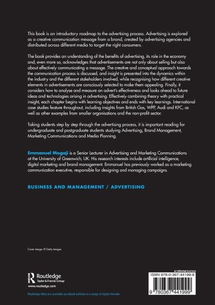 The book provides an understanding of the benefits of advertising, its role in the economy and, even more so, acknowledges that advertisements are not only about selling but also about effectively communicating a message. The creative and conceptual approach towards the communication process is discussed, and insight is presented into the dynamics within the industry and the different stakeholders involved, while recognising how different creative elements in advertisements are consciously selected to make them appealing. Finally, it considers how to analyse and measure an advert's effectiveness and looks ahead to future ideas and technologies arising in advertising. Effectively combining theory with practical insight, each chapter begins with learning objectives and ends with key learnings. International case studies feature throughout, including insights from British Gas, WPP, Audi and KFC, as well as other examples from smaller organisations and the non-profit sector.