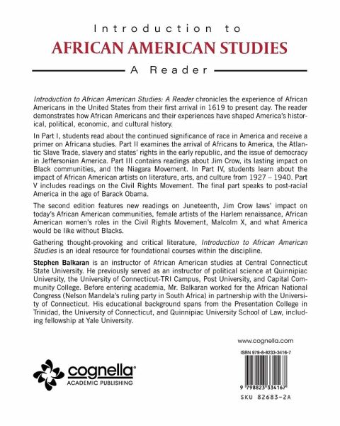 Introduction to African American Studies: A Reader chronicles the experience of African Americans in the United States from their first arrival in 1619 to present day. The reader demonstrates how African Americans and their experiences have shaped America's historical, political, economic, and cultural history. In Part I, students read about the continued significance of race in America and receive a primer on Africana studies. Part II examines the arrival of Africans to America, the Atlantic Slave Trade, slavery and states' rights in the early republic, and the issue of democracy in Jeffersonian America. Part III contains readings about Jim Crow, its lasting impact on Black communities, and the Niagara Movement. In Part IV, students learn about the impact of African American artists on literature, arts, and culture from 1927 - 1940. Part V includes readings on the Civil Rights Movement. The final part speaks to post-racial America in the age of Barack Obama. The second edition features new readings on Juneteenth, Jim Crow laws' impact on today's African American communities, female artists of the Harlem renaissance, African American women's roles in the Civil Rights Movement, Malcolm X, and what America would be like without Blacks. Gathering thought-provoking and critical literature, Introduction to African American Studies is an ideal resource for foundational courses within the discipline.