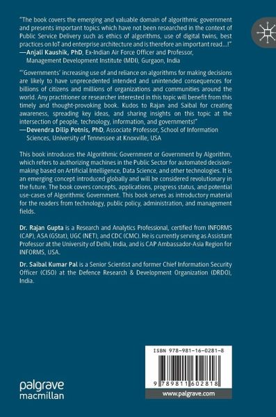 The world is changing at a fast pace, so is the Government and Governance style. Humans are bound to go for Algorithmic strategies rather than manual or electronic ones in different domains. This book introduces the Algorithmic Government or Government by Algorithm, which refers to authorizing machines in the Public Sector for automated decision-making based on Artificial Intelligence, Data Science, and other technologies. It is an emerging concept introduced globally and will be considered revolutionary in the future. The book covers concepts, applications, progress status, and potential use-cases of Algorithmic Government. This book serves as introductory material for the readers from technology, public policy, administration, and management fields.
