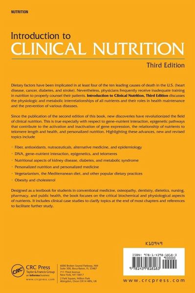 "Dietary factors have been implicated in at least four of the ten leading causes of death in the U.S. (heart disease, cancer, diabetes, and stroke). Nevertheless, physicians frequently receive inadequate training in nutrition to properly counsel their patients. Introduction to Clinical Nutrition, Third edition discusses the physiologic and metabolic interrelationships of all nutrients and their roles in health maintenance and the prevention of various diseases.Since the publication of the second edition of this book, new discoveries have revolutionized the field of clinical nutrition. This is true especially with respect to gene-nutrient interaction, epigenetic pathways that contribute to the activation and inactivation of gene expression, the relationship of nutrients to telomere length and health, and personalized nutrition. Highlighting these advances, new and revised topics include: Fiber, antioxidants, nutraceuticals, alternative medicine, and epidemiology DNA, gene nutrient interaction, epigenetics, and telomeres Nutritional aspects of kidney disease, diabetes, and metabolic syndrome personalized nutrition and personalized medicine vegetarianism, the Mediterranean diet, and other popular dietary practices. Obesity and cholesterol. Designed as a textbook for students in conventional medicine, osteopathy, dentistry, dietetics, nursing, pharmacy, and public health, the book focuses on the critical biochemical and physiological aspects of nutrients. It includes clinical case studies to clarify topics at the end of most chapters and references to facilitate further study"--Provided by publisher.