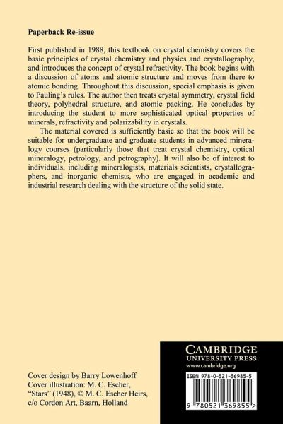 First published in 1988 this textbook on crystal chemistry covers the basic principles of crystal chemistry and physics and crystallography and introduces the concept of crystal refractivity. The book begins with a discussion of atoms and atomic structure and moves from there to atomic bonding. Throughout this discussion, special emphasis is given to Pauling's rules. The author then treats crystal symmetry, crystal field theory, polyhedral structure and atomic packing. He concludes by introducing the student to more sophisticated optical properties of minerals, refractivity and polarisability in crystals. The material covered is sufficiently basic so that the book will be suitable for undergraduate and graduate student in advanced mineralogy courses. It will also be of interest to individuals, including mineralogists, materials scientists, crystallographers and inorganic chemists who are engaged in academic and industrial research dealing with the structure of the solid state.