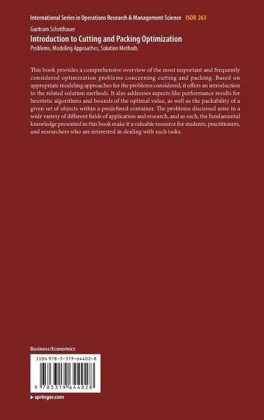 This book provides a comprehensive overview of the most important and frequently considered optimization problems concerning cutting and packing. Based on appropriate modeling approaches for the problems considered, it offers an introduction to the related solution methods. It also addresses aspects like performance results for heuristic algorithms and bounds of the optimal value, as well as the packability of a given set of objects within a predefined container. The problems discussed arise in a wide variety of different fields of application and research, and as such, the fundamental knowledge presented in this book make it a valuable resource for students, practitioners, and researchers who are interested in dealing with such tasks.