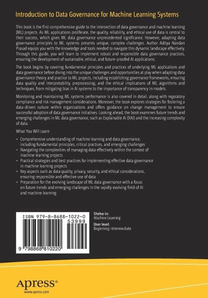This book is the first comprehensive guide to the intersection of data governance and machine learning (ML) projects. As ML applications proliferate, the quality, reliability, and ethical use of data is central to their success, which gives ML data governance unprecedented significance. However, adapting data governance principles to ML systems presents unique, complex challenges. Author Aditya Nandan Prasad equips you with the knowledge and tools needed to navigate this dynamic landscape effectively. Through this guide, you will learn to implement robust and responsible data governance practices, ensuring the development of sustainable, ethical, and future-proofed AI applications.