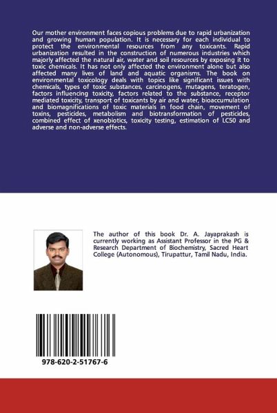 Our mother environment faces copious problems due to rapid urbanization and growing human population. It is necessary for each individual to protect the environmental resources from any toxicants. Rapid urbanization resulted in the construction of numerous industries which majorly affected the natural air, water and soil resources by exposing it to toxic chemicals. It has not only affected the environment alone but also affected many lives of land and aquatic organisms. The book on environmental toxicology deals with topics like significant issues with chemicals, types of toxic substances, carcinogens, mutagens, teratogen, factors influencing toxicity, factors related to the substance, receptor mediated toxicity, transport of toxicants by air and water, bioaccumulation and biomagnifications of toxic materials in food chain, movement of toxins, pesticides, metabolism and biotransformation of pesticides, combined effect of xenobiotics, toxicity testing, estimation of LC50 and adverse and non-adverse effects.