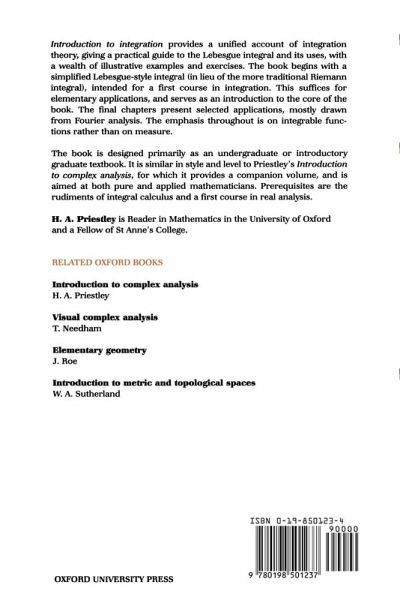 Introduction to integration provides a unified account of integration theory, giving a practical guide to the Lebesgue integral and its uses, with a wealth of illustrative examples and exercises. The book begins with a simplified Lebesgue-style integral (in lieu of the more traditional Riemann integral), intended for a first course in integration. This suffices for elementary applications, and serves as an introduction to the core of the book. The final chapters present selected applications, mostly drawn from Fourier analysis. The emphasis throughout is on integrable functions rather than on measure. The book is designed primarily as an undergraduate or introductory graduate textbook. It is similar in style and level to Priestley's Introduction to complex analysis, for which it provides a companion volume, and is aimed at both pure and applied mathematicians. Prerequisites are the rudiments of integral calculus and a first course in real analysis.