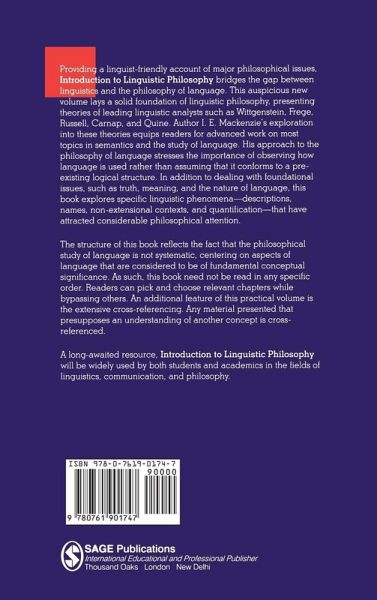 Providing an account of major philosophical issues, this essential textbook bridges the gap between linguistics and the philosophy of language. Introduction to Linguistic Philosophy presents the theories of leading linguistic analysts such as Wittgenstein, Frege, Russell, Carnap and Quine. Ian Mackenzie's exploration into these theories prepares readers for advanced work on most topics in semantics and the study of language. His approach to the philosophy of language stresses the importance of observing how language is used rather than assuming that it conforms to a pre-existing logical structure. In addition to dealing with foundational issues, such as truth, meaning and the nature of language, this book explores