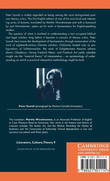 Peter Szondi is widely regarded as being among the most distinguished post-war literary critics: this is the first English translation of his important lectures on hermeneutics. He traces the historical development of hermeneutics through examination of the work of German Enlightenment theorists, and explores its relevance for the contemporary critic.