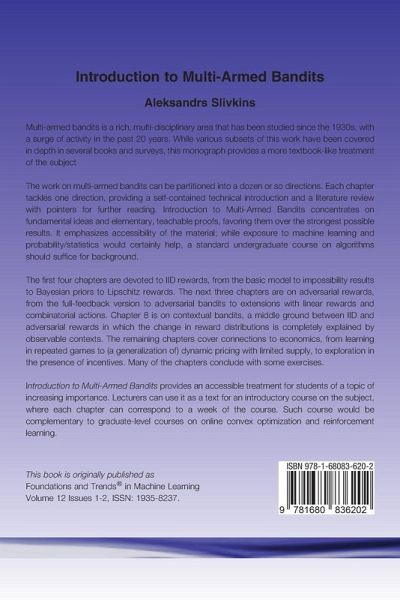 Multi-armed bandits is a rich, multi-disciplinary area that has been studied since 1933, with a surge of activity in the past 10-15 years. This is the first monograph to provide a textbook like treatment of the subject. The work on multi-armed bandits can be partitioned into a dozen or so directions. Each chapter tackles one line of work, providing a self-contained introduction and pointers for further reading. Introduction to Multi-Armed Bandits concentrates on fundamental ideas and elementary, teachable proofs over the strongest possible results. It emphasizes accessibility of the material; while exposure to machine learning and probability/statistics would certainly help, a standard undergraduate course on algorithms should suffice for background. The first four chapters are devoted IID rewards with adversarial rewards being covered in the next 3 chapters. Contextual bandits are discussed in a separate chapter before the monograph concludes with connections to economics. Each chapter contains a section on bibliographic notes and further directions. Many of the chapters conclude with some exercises. Introduction to Multi-Armed Bandits provides an accessible treatment for students of a topic that has gained importance in the last decade. Lecturers can use it as a text for an introductory course on the subject.