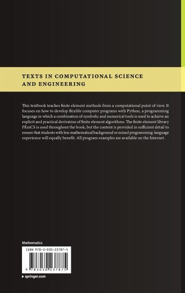 This textbook teaches finite element methods from a computational point of view. It focuses on how to develop flexible computer programs with Python, a programming language in which a combination of symbolic and numerical tools is used to achieve an explicit and practical derivation of finite element algorithms. The finite element library FEniCS is used throughout the book, but the content is provided in sufficient detail to ensure that students with less mathematical background or mixed programming-language experience will equally benefit. All program examples are available on the Internet.