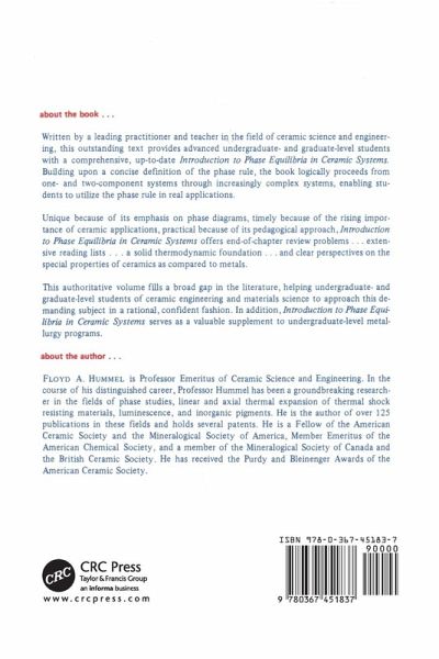Written by a leading practitioner and teacher in the field of ceramic science and engineering, this outstanding text provides advanced undergraduate- and graduate-level students with a comprehensive, up-to-date Introduction to Phase Equilibria in Ceramic Systems. Building upon a concise definition of the phase rule, the book logically proceeds from one- and two-component systems through increasingly complex systems, enabling students to utilize the phase rule in real applications. Unique because of its emphasis on phase diagrams, timely because of the rising importance of ceramic applications, practical because of its pedagogical approach, Introduction to Phase Equilibria in Ceramic Systems offers end-of-chapter review problems, extensive reading lists, a solid thermodynamic foundation and clear perspectives on the special properties of ceramics as compared to metals.This authoritative volume fills a broad gap in the literature, helping undergraduate- and graduate-level students of ceramic engineering and materials science to approach this demanding subject in a rational, confident fashion. In addition, Introduction to Phase Equilibria in Ceramic Systems serves as a valuable supplement to undergraduate-level metallurgy programs.