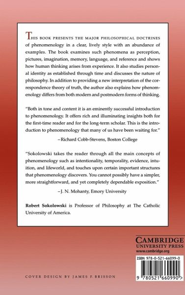 This book presents the major philosophical doctrines of phenomenology in a clear, lively style with an abundance of examples. The book examines such phenomena as perception, pictures, imagination, memory, language, and reference, and shows how human thinking arises from experience. It also studies personal identity as established through time and discusses the nature of philosophy. In addition to providing a new interpretation of the correspondence theory of truth, the author also explains how phenomenology differs from both modern and postmodern forms of thinking.