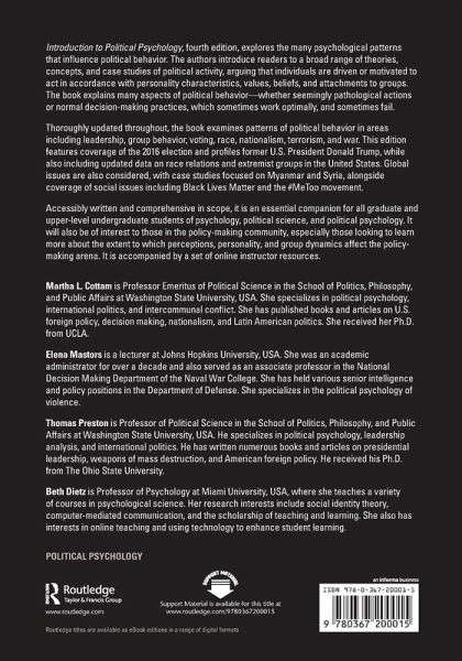 Introduction to Political Psychology explores the many psychological patterns that influence individual political behavior. The authors introduce readers to a broad range of theories, concepts, and case studies of political activity, arguing that individuals are driven or motivated to act in accordance with personality characteristics, values, beliefs, and attachments to groups. The book explains many aspects of political behavior-whether seemingly pathological actions or normal decision-making practices, which sometimes work optimally, and sometimes fail.