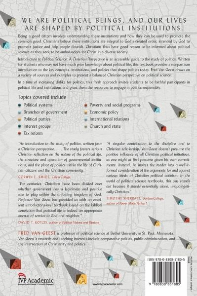 Evangelical Christian Publishers Association Top Shelf Book Cover Award 2017 We are political beings and our lives are shaped by political institutions. Being a good citizen involves understanding these institutions and how they can be used to promote the common good. Christians further believe these institutions are integral to God's created order, intended by God to promote justice and help people flourish. Christians thus have good reason to be informed about political science as they seek to be ambassadors for Christ in a diverse society. Introduction to Political Science: A Christian Perspective is an accessible guide to the study of politics. Written for students who may not have any prior knowledge about political life, this textbook provides a nonpartisan introduction to the key concepts, institutions, and policies that shape politics today. Fred Van Geest draws on a variety of sources and examples to present a balanced Christian perspective on political science. Christians, he argues, are called to engage in political action in order to advance public justice, even though full shalom is ultimately the work of God alone. IVP Instructor Resources include an Instructor's Guide and Student's Study Guide.