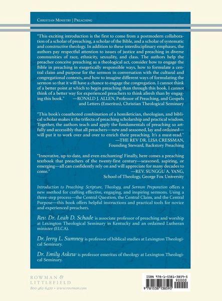 Coauthored by a homiletician, a theologian, and a biblical scholar, this book is a preaching primer that provides tools for crafting effective, engaging, and inspiring sermons. Using a unique workbook-style format, Introduction to Preaching equips seminarians and preachers to use appropriate theological claims informed by solid biblical interpretation while providing several sample sermons from the authors. Readers will learn how to use a three-part schema-the Central Question, the Central Claim, and the Central Purpose-to provide the drive, direction, and destination for the sermon. Offering…mehr