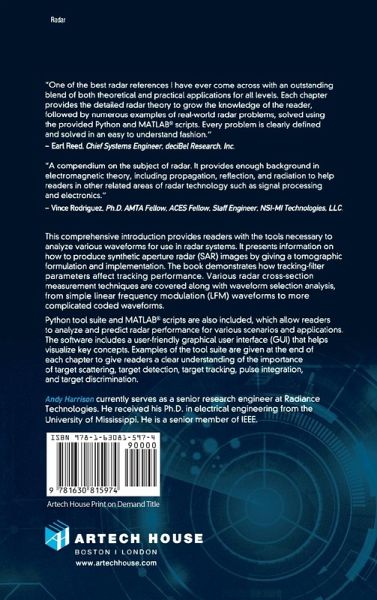 This comprehensive resource provides readers with the tools necessary to perform analysis of various waveforms for use in radar systems. It provides information about how to produce synthetic aperture (SAR) images by giving a tomographic formulation and implementation for SAR imaging. Tracking filter fundamentals, and each parameter associated with the filter and how each affects tracking performance are also presented. Various radar cross section measurement techniques are covered, along with waveform selection analysis through the study of the ambiguity function for each particular waveform from simple linear frequency modulation (LFM) waveforms to more complicated coded waveforms.The text includes the Python tool suite, which allows the reader to analyze and predict radar performance for various scenarios and applications. Also provided are MATLAB(R) scripts corresponding to the Python tools. The software includes a user-friendly graphical user interface (GUI) that provides visualizations of the concepts being covered. Users have full access to both the Python and MATLAB source code to modify for their application. With examples using the tool suite are given at the end of each chapter, this text gives readers a clear understanding of how important target scattering is in areas of target detection, target tracking, pulse integration, and target discrimination.