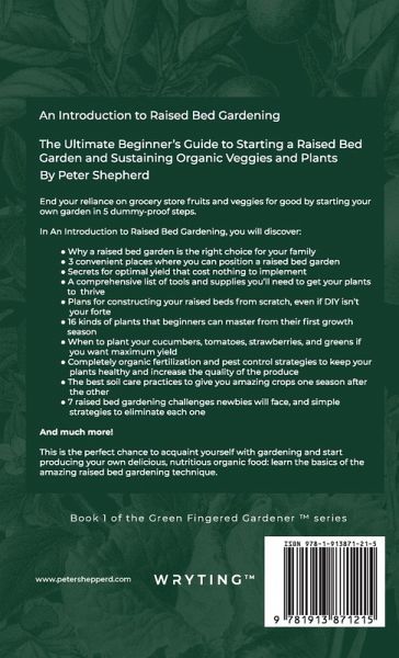 End your reliance on grocery store fruits and veggies for good by starting your own garden in 5 dummy-proof steps. Paperback version has over 40 amazing black and white images, for colour images please choose the Hardback or eBook versions that have all images in glorious colour. Imagine making a delicious salad for your family in the evening. You open the fridge just to find that you've run out of cucumbers. Closing the fridge door gently, you go out in the backyard and walk by your raised bed garden. There, fresh, delicious, and crispy homegrown cucumbers await you. All you have to do is pick them off the plant, wash them, and chop them up. Does this idyllic picture seem too out of reach? It shouldn't be! Raised bed gardening is the perfect simple approach for beginners who want to grow their own food. You'll be free from having to worry about weeds, pests, and extensive soil manipulations. Not only that, but raised bed gardening also offers ideal conditions for growing a wide range of fruits, vegetables, herbs, and flowers. You may now be thinking: So, what does it take to get started? All you will need to do is complete 5 simple steps to put together your raised bed garden, plant your fruits and veggies, and ensure optimal yields. In an Introduction to Raised Bed Gardening, you will discover: ¿ Why a raised bed garden is the right choice for your family ¿ The most optimum places you can position a raised bed garden ¿ Secrets for optimal yield that cost nothing to implement ¿ A comprehensive list of tools and supplies you'll need to get your plants to thrive ¿ Instructions for constructing your raised beds from scratch, even if DIY isn't your forte ¿ 10 kinds of plants that beginners can master from their first growth season ¿ When to plant your cucumbers, tomatoes, strawberries, and greens if you want maximum yield ¿ Completely organic fertilization and pest control strategies to keep your plants healthy and increase the quality of the produce ¿ The best soil care practices to give you amazing crops one season after the other ¿ 7 raised bed gardening challenges newbies will face, and simple strategies to eliminate each one And much more!