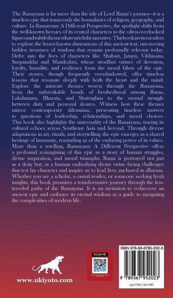 The Ramayana is far more than the tale of Lord Rama's journey-it is a timeless epic that transcends the boundaries of religion, geography, and culture. In Ramayana: A Different Perspective, the spotlight shifts from the well-known heroics of its central characters to the often-overlooked figures and subtle themes that enrich the narrative. This book invites readers to explore the lesser-known dimensions of this ancient text, uncovering hidden treasures of wisdom that remain profoundly relevant today. Delve into the lives of characters like Shabari, Jatayu, Vibhisana, Surpanakha and Mandodari, whose steadfast virtues of devotion, loyalty, humility, and resilience form the moral fabric of the epic. Their stories, though frequently overshadowed, offer timeless lessons that resonate deeply with both the heart and the mind. Explore the intricate themes woven through the Ramayana, from the unbreakable bonds of brotherhood among Rama, Lakshmana, Bharata, and Shatrughna to the eternal struggle between duty and personal desires. Witness how these themes mirror contemporary dilemmas, presenting timeless answers to questions of leadership, relationships, and moral choices. This book also highlights the universality of the Ramayana, tracing its cultural echoes across Southeast Asia and beyond. Through diverse adaptations in art, rituals, and storytelling, the epic emerges as a shared heritage of humanity, reminding us of the enduring power of its values. More than a retelling, Ramayana: A Different Perspective offers a profound reimagining of this epic as a story of human struggles, divine inspiration, and moral triumphs. Rama is portrayed not just as a deity but, as a human embodying divine virtue facing challenges that test his character and inspire us to lead lives anchored in dharma. Whether you are a scholar, a casual reader, or someone seeking fresh insights, this book promises a transformative journey through the lesstraveled paths of the Ramayana. It is an invitation to rediscover an ancient epic and embrace its eternal wisdom as a guide to navigating the complexities of modern life.