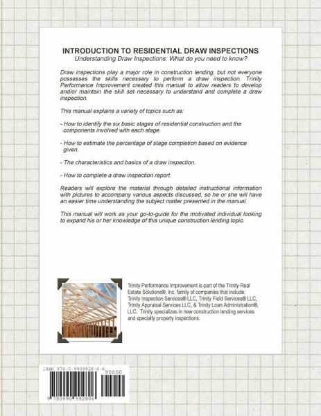Draw inspections play a major role in construction lending, but not everyone possess the skills necessary to perform a draw inspection. Trinity created this manual to allow readers to develop or maintain the skill set necessary to understand and complete draw inspections. This book explains a variety of topics such as: - How to identify the six basic stages of construction and the components involved with each stage. - How to estimate the percentage of stage completion based on evidence given. - The characteristics and basics of a draw inspection. - How to complete a draw inspection report. Readers will explore the material through detailed information and over 160 photographs to accompany various aspects discussed, so he or she will have an easier time understanding the subject matter presented in the manual. This book will work as your go-to-guide for the motivated individual looking to expand your knowledge of this unique construction lending topic.